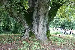 Die jahrhundertealte Rosskastanie⊙ im Schlosspark mit einem Stammumfang von über sechs Metern ist eine der größten und ältesten ihrer Art in Deutschland. Der als Naturdenkmal ausgewiesene und in die Liste markanter und alter Baumexemplare in Deutschland eingetragene Baumveteran hat laut unterschiedlicher Quellen ein geschätztes Alter von 300–500 Jahren.[3] Sein monumentaler, knorriger Grundstamm verzweigt sich schon in geringer Höhe in mehrere, stammdicke Starkäste. Drei davon, steil nach oben strebend, bilden die kandelaberartige hohe Krone. Zwei weitere gehen schräg vom Stamm ab. Mehrere Ausbruchstellen am Stamm zeugen von früheren, tiefen Querästen. Eine Messung im Jahr 2014 ergab einen Umfang von 6,51 m und eine Höhe des Baumes von 26 m.[4] Bereits 1911 wurde der Baum mit einem Stammumfang von damals 5,40 m als „stärkste Roßkastanie Deutschlands“ bezeichnet, 1841 wurde ihr Umfang mit 17 Fuß (4,87 m) angegeben.[5]