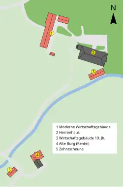 Die Anlage besteht aus dem barocken Herrenhaus, Wirtschaftsgebäuden und einer Mühle sowie einem Schlosspark.
