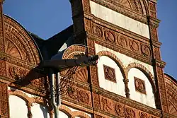 - jedoch wird am Terrakotta-Flügel auch dessen äußere Form aufwendig mit Rundbögen nebst Fächerrosetten und Steinfiguren gestaltet, wohingegen am Backstein-Flügel die sehr einfache Treppengiebel- bzw. Staffelgiebel-Form der Gotik fortbesteht.