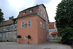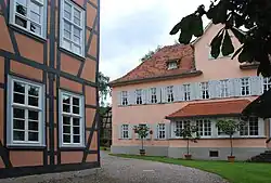 - auf der Ostseite ein zweites, kleineres Wohnhaus, ursprünglich als das „Neue Schloss“ bezeichnet, das 1693 vollendet wurde, und dem daran nach Süden anschließenden langgestreckten Fachwerkwohnhaus, dem „Alten Gutshaus“.