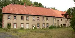Der Gutshof und das dahinter liegende Schloss sind über eine Brücke über einen Wassergraben zugänglich. Der Zugang wird beidseitig von ehemaligen Gesindehäusern eingefasst. Seitlich schließen sich ein Brauhaus und Speicherräume an. Weitere Gebäude sind vier symmetrisch angeordnete Ställe und Scheunen. Wie auch das Schloss sind die Wirtschaftsgebäude in Massivbauweise mit Putzfassaden ausgeführt. Früher befanden sich auf dem Gelände zwei Wassermühlen an einem Wasserlauf mit angestauten Teichen, die heute nicht mehr bestehen.