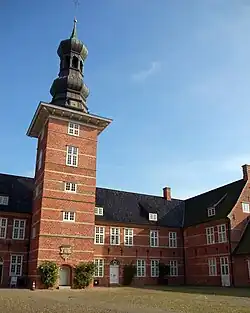 Das Husumer Schloss wurde von 1577 bis 1582 errichtet. Es ist ein zweigeschossiges, dreiflügeliges Gebäude mit einem markanten Mittelturm. Einen langen Mitteltrakt flankieren zwei kürzere Seitenflügel, der südliche ist durch einen eingeschossigen Wirtschaftsbau verlängert, das Pendant im Norden – der Küchenbau – gegen den Hof zurückversetzt. Der Grundriss des Hauptgebäudes ähnelt einem großen „E“. Erbaut im Stile der Niederländischen Renaissance, wurde das rote Backsteingebäude um 1612, 1750 und 1792 mehrmals modernisiert und umgestaltet.[12] In seiner über 400-jährigen Geschichte diente das Schloss länger als Verwaltungsgebäude denn als fürstliche Residenz. Die Anlage eines Hauptgebäudes mit zwei separaten seitlichen Wirtschaftsgebäuden findet sich 200 Jahre später bei Matthieu Soirons Schloss Wickrath aus den Jahren 1746 bis 1772.