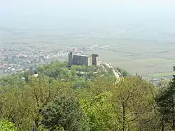 Die Bergkuppe trägt das Hambacher Schloss. Nachdem es im 11. Jahrhundert als Kästenburg[5] errichtet worden war, wurde es dreimal zerstört: 1552 durch den Söldnerführer Albrecht Alcibiades, 1688 im Auftrag von König Ludwig XIV. durch den französischen General Mélac und letztmals 1794 durch französische Revolutionstruppen.