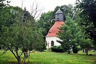 Bei der Schlosskapelle handelt es sich um einen eingeschossigen verputzten Feldsteinbau mit rundem Grundriss. Die Entstehungszeit der Kirche wird auf das letzte Drittel des 16. Jahrhunderts datiert. Vermutlich handelt es sich bei der Kirche ursprünglich um den Rest eines der Ecktürme einer einstmals hier befindlichen und später zum Wasserschloss umgebauten Burganlage. Um 1744 erfolgten Umbauarbeiten am Bauwerk.[1] Dabei erhielt das Gebäude auch sein heute zu sehendes Schweifdach mit der mittig aufgesetzten oktogonalen und verschieferten Laterne.[2]