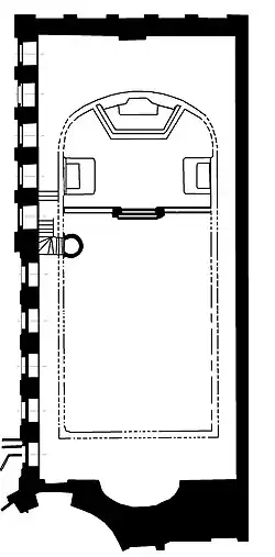 Auf der Südostseite, den Fenstern der Nordwestwand entsprechend, befinden sich sechs Ölgemälde auf Leinwand: