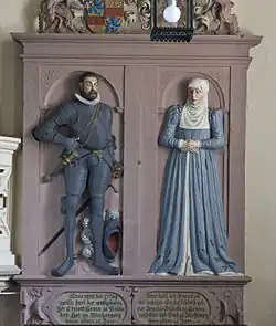 Rechts neben der Grabplatte der Eltern, mittschiffs an der südlichen Außenwand der Kirche, befindet sich ein mit reichem Beschlagwerk und Wappen geschnitztes hölzernes Epitaph von 1587 für einen Sohn und vier Töchter des Grafen Conrad mit Elisabeth, die im Kindesalter an den Blattern verstorben sind.