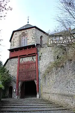 Die Braunfelser Schlosskirche in der Stadt Braunfels im Lahn-Dill-Kreis in Hessen ist eine spätgotische Hallenkirche. Die im Jahr 1501 fertiggestellte dreischiffige Kirche hat einen 3/8-Chor und eine nördlich angebaute Sakristei. Sie diente bis zum Jahr 1883 als Grablege der Grafen und Fürsten von Solms-Braunfels. Die Kirche ist aufgrund ihrer geschichtlichen, künstlerischen, städtebaulichen und wissenschaftlichen Bedeutung hessisches Kulturdenkmal.[1] Sie ist heute Teil des fürstlichen Museums und wird von der evangelischen Kirchengemeinde und seit den 1980er Jahren gelegentlich von der katholischen Gemeinde genutzt.
