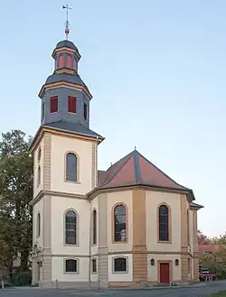 - ↑ Nach der 1669 erbauten und 1910 abgebrochenen Kirche in Helpershain im Vogelsberg entstand somit der zweite Quersaalbau in Hessen-Darmstadt.