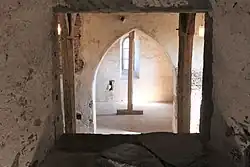 Die spätgotische Katharinenkapelle des 15. Jahrhunderts ist östlich des Turms angebaut. Sie ist ein schlichter zweigeteilter Rechteckraum mit 1 Meter dicken Mauern, in den ein 3,50 Meter breiter spitzbogiger Chorbogen eingezogen ist. Die lichte Weite beträgt 14 Meter, die Breite 8 Meter und die Höhe innen 6 Meter.[15] Die Kapelle wird durch zwei Spitzbogenfenster im Süden und eins im Osten mit Gewänden aus Schalstein belichtet und hat Schießscharten im Altarraum.[15] In der vorkragenden Westwand ist eine kleine quadratische Öffnung eingelassen. In der Ostwand befindet sich eine Piscina.[17] Der Boden ist mit großen Steinplatten belegt, die teils rekonstruiert wurden und zwischen denen Bachkiesel fischgrätartig verlegt sind. Unter dem Boden des Gemeindesaals befindet sich ein weiterer kleiner gewölbter Raum mit Schießscharten.[12] Im Bereich des ehemaligen Grafenstuhls sind Mauern zur Verstärkung der Schlosskirche eingebaut.