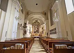 Das Kircheninnere zeigt sich als barocker zentralisierter Saalraum um 1751, das quadratische platzlgewölbte Hauptjoch steht zwischen je einem kürzeren Joch mit einer Stichkappentonne, das Ostjoch als Chor wird durch eine segmentbogenartige Apsisausrundung geschlossen.