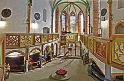 Der hohe Innenraum ist von Kreuzgewölben überspannt, deren gekehlte Rippen über runden Diensten mit gekehlter Basis und stilisierten Blattkapitellen aufsteigen; ähnliches Blattwerk ist an den Gewölbeschlusssteinen zu finden. Um drei Seiten des Schiffes zieht sich eine schmale spätgotische Empore aus Stein mit Resten alter Polychromie, die den Raum bestimmt und ihn als Herrschaftskapelle charakterisiert. Zwischen den Jahren von etwa 1519 und 1521 (nach einer Jahreszahl auf dem Brüstungsfeld der Südwestempore) wurden die Emporen in mehreren Bauabschnitten eingebaut, beginnend im Südwesten, danach im Nordosten, schließlich im Nordwesten. Diese Reihenfolge ist an stilistischen Unterschieden wie spitzbogige und rundbogige Arkaden, spiralförmig gekehlte und achteckige Säulen, steiferes oder lockeres Maßwerk in den Brüstungsfeldern und von Astwerk gerahmten Figurennischen ablesbar. Die zugehörigen Figuren sind nicht erhalten; die heutigen wurden im Jahr 1907 geschaffen. An der Nordostempore ist der Umriss einer später abgeschlagenen männlichen Figur mit Inschrift zu erkennen, die vermutlich den Erbauer der Emporen Thomas Kelner darstellt. Die Emporen werden über eine breite Wendeltreppe an der Nordostempore sowie früher durch zwei Zugänge von den Schlössern Vorderort und Mittelort auf die Südwest- und die Nordostempore erschlossen. Zwischen Schiff und Chor ist ein prachtvolles lettnerartiges Gitter aus Schmiedeeisen aus der Zeit um 1520 mit seitlichen Durchgängen und einer Bekrönung aus der Frührenaissance mit Kerzenhaltern, Rankenwerk wappenhaltenden Engel und Tiergrotesken aufgestellt; in der Mitte ist die in der Rückseite als Gitterkorb ausgebildete Kanzel angeordnet. Sechs neugotische Glasmalereien aus den Jahren 1883–1908 sind erhalten.