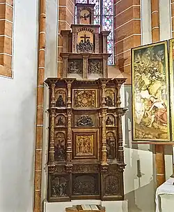 Die reiche Ausstattung im Stil der Spätgotik und der Frührenaissance stammt hauptsächlich aus den ersten Jahrzehnten des 16. Jahrhunderts. Hauptstück der Ausstattung ist ein großer Flügelaltar mit „sehr qualitätvoller, eigentümlich stilisierter“[2] Malerei aus dem Umkreis von Lucas Cranach dem Älteren, vermutlich von Hans Döring aus der Zeit um 1518/1520, der in den Jahren 1952–1955 und 1963 restauriert wurde. Auf der Mitteltafel ist die Kreuzigung Christi dargestellt, auf den Flügeln Christus in der Vorhölle und seine Auferstehung, in der Predella die Beweinung Christi und auf den Außenseiten der Flügel die Verkündigung an Maria.