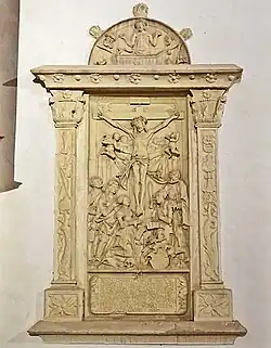 Das Epitaph des Grafen Günther IV. von Mansfeld-Hinterort († 1526) wurde in voll entwickelten Frührenaissanceformen gestaltet. Dieses Epitaph ist eines der frühesten Beispiele dieses Stils in Mitteldeutschland und wird Hans Schlegel zugeschrieben. Es zeigt in der Mitte ein Relief des Gekreuzigten mit drei Heiligen sowie dem Verstorbenen und seiner Frau, welches Beziehungen zu dem Meister Hans Backoffen und seiner Werkstatt erkennen lässt. Im halbrunden Aufsatz ist ein Relief mit einem Relief des Schmerzensmanns zu sehen, auf dem vorgesetzten Rahmen Ornamente und Grotesken der Renaissance. Die Grabplatte des Grafen Albrecht IV. von Mansfeld-Hinterort († 1560) befand sich ursprünglich in der Mansfelder Stadtkirche und wurde 1907 restauriert. Sie zeigt den Verstorbenen mit Rüstung in Hochrelief, mit den Wappen Mansfeld, Honstein, Altenburg und Beichlingen in den Ecken. Einige runde Totenschilde der Grafen Johann Georg († 1647) und Hoyer Christoph († 1653) sind weiter zu erwähnen. Eine „qualitätvolle“[2], nachträglich hierher versetzte Ofenplatte aus Gusseisen zeigt die Geschichte vom reichen Mann und armen Lazarus mit der Jahreszahl 1557, stammt aus Hessen und steht in Beziehung zu Philipp Soldan.