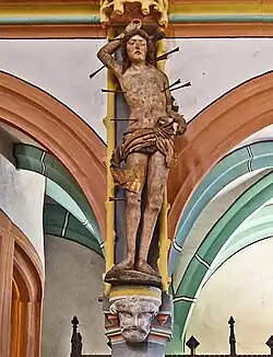 Im Schiff steht ein achteckiger, kelchförmiger Taufstein mit der Jahreszahl 1522 auf einer kreisförmigen Stufe, der am Becken mit spätgotischem Blendmaßwerk verziert ist. Ein überlebensgroßer Christus aus der Zeit um 1520 wurde 1907 restauriert und an die Nordwand versetzt. Er befand sich ursprünglich am Chorgitter und wird als „vorzügliches Werk der naturalistisch-expressiven Spätgotik“[2] gewürdigt. Weiter sind mehrere Schnitzfiguren unbekannter Herkunft aus der Zeit um 1520 zu erwähnen. Dazu zählen eine Maria auf der Mondsichel, eine Schmerzensmutter und ein heiliger Sebastian an den Emporen sowie ein Christophorus und eine Anna Selbdritt, welche 1907 dort aufgestellt wurden.