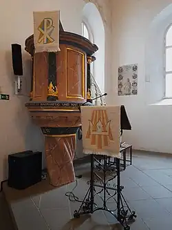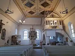 Das Innere ist durch eine große Felderdecke über einer breiten Kehle mit dreizehn Gemälden aus dem Alten und Neuen Testament abgeschlossen. Reste spätgotischer Wandmalereien des 17. Jahrhunderts sind an der Innenseite der mit Stabwerk verzierten Südtür erhalten; sie zeigen den Heiligen Michael. In der Südostecke des Saales ist eine steinerne Patronatsempore über einem kreuzgratgewölbten, kapellenartigen Raum eingebaut, der durch zwei Rundbögen zum Saal geöffnet ist. Die Empore schloss einst mit der Sandsteinbrüstung ab, der verglaste Holzaufbau darüber wurde vermutlich im 18. Jahrhundert eingebaut. Die konvex geschwungene Westempore auf vier gedrehten Säulen ist ein Werk des 18. Jahrhunderts.