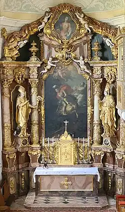 Das bereits 1719 erstellte linke Seitenaltarbild stellt Maria Immaculata dar. Im rechten Seitenaltarbild (Johann Caspar Sing, 1723) ist zu betrachten, wie die heiliggesprochene Kaiserin Kunigunde bei einem Gottesurteil über glühende Pflugscharen schreitet. Dies soll sich auf Burgrain ereignet haben. Das Bild des die ganze Chorbreite einnehmenden Hochaltars stellt den Hl. Georg hoch zu Ross dar, ebenfalls von Johann Caspar Sing. Zum neuen Hochaltar, der 1723 fertiggestellt wurde, hatte die Schreinerarbeit der Kistler Nessaner geliefert; dem „Johann Caspar Sing, mallern zu München wurde 1721 umb das große Altarplath S. Georgi wie auch das Bildtnus S. Catharinae 260 fl. ausgezahlt“.[2]