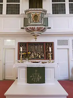 Der Flügelaltar zeigt im mittleren Hauptfeld die Kreuzigungsszene, die wegen der vielen Figuren unter dem Kreuz auch „Kreuzigung mit dem Gedräng“ genannt wird. In den beiden Flügeln stehen die Figuren der zwölf Apostel.