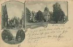 Ansichtskarte von Schloss Schillersdorf sowie dem Ostrauer und dem Evelinentor (um 1900)