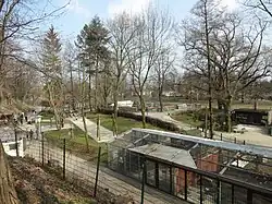 Der Senftenberger Tierpark befindet sich ebenfalls im Schlosspark und wird begrenzt durch die Wallanlage der Festung und die Schwarze Elster. Am 12. Juni 1931 wurde er mit einheimischen Tieren, einem schwarzen Edelhirsch, einem Damwild- und einem Rehpaar sowie einem Schwanenpaar besetzt. 1937 kamen viele Vögel, Heidschnucken, Perlhühner, Langohrziegen, Iltisse, Biber und Waschbären, Affen und ein Reitesel hinzu. Im Folgejahr ging der Betrieb des Tierparks aus der privaten Verwaltung an die Stadt über.[6] Der Eingang bestand aus einem halbrunden Fachwerkbau mit einem Walmdach, welcher während und nach dem Zweiten Weltkrieg als Materiallager genutzt wurde. Nachdem der Tierpark ab 1940 wegen des Zweiten Weltkriegs im Mindestbetrieb geführt wurde, wurde er am 14. Juli 1954 wiedereröffnet. Im Jahr 1957 wurde das Bärengehege mit den beiden Braunbären Puppi und Moritz besetzt; es kamen hier über 50 Bären zur Welt. Von 1978 bis 2001 leitete Norbert Kiebeler (1954–2019) den Tierpark. Ihm folgte Jens Beyer (geb. 1966) im Amt. 2008 übergab die Stadt Senftenberg die Bewirtschaftung an die Integrationswerkstätten gGmbH Niederlausitz. 2009 begann der Bau eines neuen Eingangsbereiches mit Umweltbildungszentrum, die am 18. April 2011 eingeweiht wurden.[6] Im Mai 2012 wurden die letzten Bären in einen Tierpark im Schwarzwald umgesiedelt.[7] 2014 ging die Bewirtschaftung von der Integrationswerkstätten gGmbH Niederlausitz an eine neu gegründete WBS Tierpark-Betriebs GmbH über. 2020 wurde mit Hilfe von Spendengeldern ein Gehege für Varis eingerichtet.[6][8] Im Laufe der Zeit wurde der Bestand der einheimischen Tiere mit exotischen Exemplaren wie Rhesusaffen, Leoparden und Erdmännchen ergänzt.