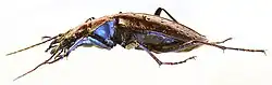 Der Kopf ist im Verhältnis zum Halsschild relativ groß und besitzt große und sehr breite, asymmetrische Mandibeln (Bild 2). Wie bei allen Laufkäfern besteht die Antenne aus elf Gliedern, die ersten beiden sind rötlich gefärbt. Der Halsschild ist breiter als lang, jedoch nur wenig breiter als der Kopf. Die elliptischen Flügeldecken liegen sehr flach auf dem Körper. Auf den Flügeldecken befinden sich in den Primärreihen unregelmäßig angeordnete rotgoldene oder goldgrüne Punktgruben mit großen Grübchen.[1][3] Der vordere Seitenrand ist grünlich.[2]