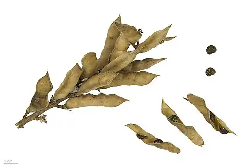 Die dicht behaarte, gerade Hülsenfrucht enthält vier bis sieben Samen. Sie ist 5 bis 7 Zentimeter lang und 1 bis 1,25 Zentimeter breit und gelbbraun.[2] Die Samen sind eiförmig, etwa 6,8 bis 8 Millimeter lang, 5,4 bis 6,8 Millimeter breit und glatt.[2] Sie sind meist hellgrau und braun marmoriert, seltener auch rahmweiß bis gelbrötlich.[2]