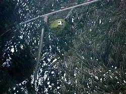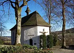 Kapelle Auf dem Werth von 1682 und vermutlicher Standort der „Smalen Burg“ im Hintergrund Kloster Grafschaft