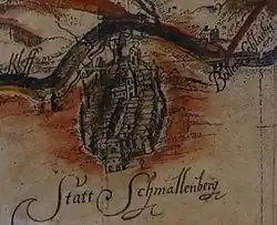 1244 beschloss der Erzbischof von Köln, sich mit dem Kloster Grafschaft zusammenzutun, um die Siedlung zu befestigen. Beide teilten sich die Kosten für die Befestigungsanlage. Die Lage auf dem Bergrücken, welcher auf drei Seiten vom Fluss Lenne umflossen wird, ließ Schmallenberg als uneinnehmbar gelten. Nach dem offenen Norden hin war die Stadt durch eine Landwehr geschützt. Drei Tore im Norden, Süden und Osten gewährten Einlass in die Stadt.[13] Die Burg verblieb außerhalb der Befestigung und verlor damit ihre Funktion.[12] Im selben Jahre – es wird heute angenommen, dass die Burg zu diesem Zeitpunkt bereits verfallen war – verlieh der Kölner Erzbischof Konrad von Hochstaden in seiner Funktion als Herzog von Westfalen Schmallenberg die Stadtrechte.