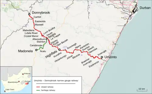 | Schmalspurbahn Umzinto–Donnybrook | |||||||||||||||||||||||||||||||||||||||||||||||||||||||||||||||||||||||||||||||||||||||||||||||||||||||||||||||||||||||||||||||||||||||||||||||||||||||||