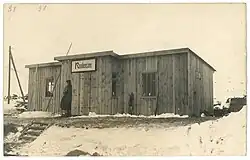 Bahnhofsgebäude Rautensee | Das Bahnhofs- und Feldbahnpersonal konnte sich für dienstliche Aufgaben in einer aus Holz errichteten Baracke vor den Witterungseinflüssen schützen, das mit einem Ortsschild verwechslungssicher gekennzeichnet war. |