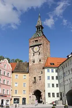 Der Schmalzturm, auch schöner Turm genannt, ist ein Bauwerk der ersten Stadtmauer von Landsberg am Lech, der sich am höchsten Punkt des schräg nach Westen neigenden Hauptplatzes erhebt und als erstes östliches Stadttor der Kernstadt wohl noch im 13. Jahrhundert gebaut wurde.[1] Als Zierde laufen Kleeblattfriese um den Turm; bunte Dachziegel, in den Stadtfarben gehalten, und ein Sturmglockenaufsatz geben der Wichtigkeit des Tores Ausdruck. Den Beinamen »Schmalzturm« erhielt er, da sich an schönen Tagen die Marktfrauen mit ihrer Ware, unter anderem auch Schmalz, in den Schatten des Tores stellten. Das Schmalz blieb so fester und konnte besser verkauft werden.