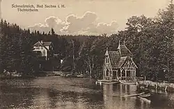 Ende des 19. Jahrhunderts wurde das Westufer mit der Bismarckstraße durchgängig bebaut. Hier stehen einige historische Villen, wie die im Jahr 1900 erbaute Villa Vida.[5] Sie ist heute Teil des 1978 eröffneten Fünf-Sterne-Hotels Romantischer Winkel.[6] Bad Sachsa weist bis heute einen außergewöhnlich großen Bestand an prächtigen Villen bzw. Häusern aus der Zeit zwischen 1880 und 1914 auf.[7] An der Ostseite des Schmelzteichdamms steht das 1962/63 nach Plänen des Architekten Hans Jaeckel erbaute Kurhaus.[8]