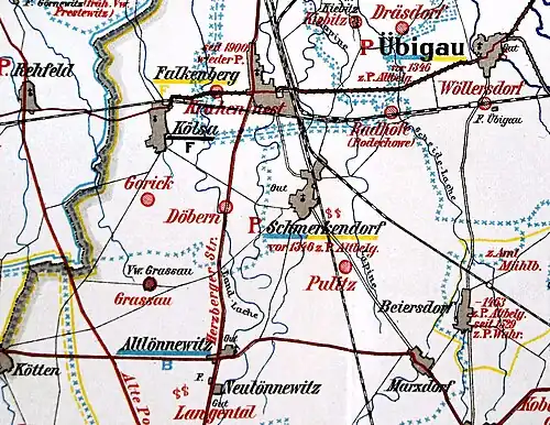 - ↑ a b c Amt Falkenberg/Uebigau mit seinen Gemeinden. Stadtbuchverlag W+I GmbH und Co.KG Zeuthen, 1996, S. 9 (Broschüre).