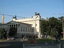 Das strenghistoristische Doppelhaus wurde 1874–1875 von Heinrich Claus und Joseph Gross in Formen der Wiener Neorenaissance erbaut. Es besitzt Sockelarkaden und seichte Eckrisalite sowie Balkone und ist ortsteingequadert. Das Gebäude ist der Hinterseite des Parlaments (Reichsratsstraße) unmittelbar benachbart.