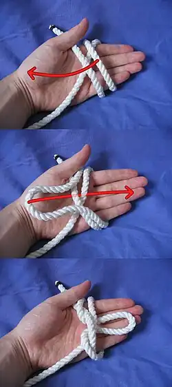 Das Seil wird über die linke Hand mit der Handfläche nach oben gelegt. Nun wickelt man das Seil, das vom Zeigefinger hinten herunterhängt, zweimal zu sich um die Hand, die letzte Wicklung verläuft dabei zwischen den ersten beiden Strängen. Drei Seile verlaufen nun über die Handfläche. Man nimmt das Seil, das am nächsten zu den Fingerspitzen liegt, und zieht es Richtung Handballen über die zwei anderen Seile zu sich. Anschließend nimmt man die entstandene Schlaufe und zieht sie unter den zwei anderen Seilen wieder hindurch. Die Enden zieht man dann nur noch nach außen fest.