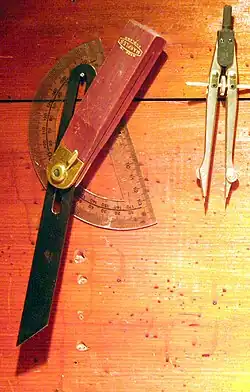 Die Schmiege, auch Winkelschmiege, Stellschmiege oder Schrägmaß genannt, ist ein in vielen Handwerksberufen verwendeter, verstellbarer Winkel zum direkten Übertragen von unbestimmten Winkeln auf Werkstücke.[1] Die Schmiege besteht aus einem geschlitzten Schenkel und einer verstellbaren Zunge, die sich aufklappen und unter einem bestimmten Winkel durch eine Feststellschraube – ähnlich wie bei einem Tafelzirkel – fixieren lässt. Schmiegen gibt es ganz aus Holz oder Metall sowie aus Kombination von beidem.