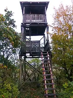 Auf einer etwa 500 Meter südwestlich des Ortes liegenden Anhöhe (386 m NN)[12] befindet sich ein alter Wasserhochbehälter von 1898,[12] auf dem 1980[13] vom Verein der Rosenfreunde Schmitshausen e.V und dem örtlichen Verschönerungsverein ein 8,4 m[14] hoher hölzerner Aussichtsturm errichtet wurde. Von der oberen, auf 5,8 m[14] Turmhöhe liegenden überdachten Aussichtsplattform hat man einen guten Blick über die Hügellandschaft der Sickinger Höhe bis hin zum Hunsrück.