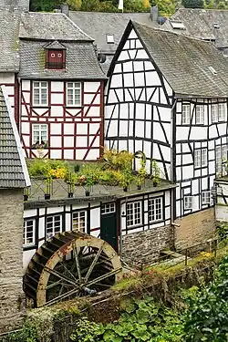 - ↑ Die Hausnummer-Angaben in den Weblinks „Rheinische Industriekultur“ und „ISG Monschau“ entsprechen nicht mehr den heutigen (2024) Gegebenheiten. Es handelt sich hierbei eher um die Haus-Nummern 2, 4, 6, 6a (entspricht dem Scheibler’schen Spinnereigebäude von 1804), 8 und 10 mit den Anbauten auf der zu Rur gelegenen Seite (u. a. Radhaus) bis zur Nordseite von Haus-Nr. 14 (entspricht der Rückseite von Hotel Horchem)