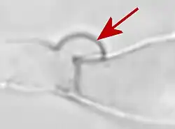 Nur die endständigen Zellen einer Hyphe verdoppeln sich. Dabei verlängert sich zuerst die Zelle, bis sich die Zellkerne verdoppelt haben (A' und B' als neu entstandene Kerne) und die Zelle eine Ausstülpung, die spätere Schnalle, gebildet hat. A' und B' wandern ans Ende der Zelle, während B in die Schnalle und A an das andere Ende der Zelle, nahe den anderen Hyphenzellen, mit Hilfe des Cytoskeletts transportiert werden. Die Schnalle bildet eine Zellwand aus, die B von der Zelle abgrenzt und kurz darauf eine Verbindung mit der gleichen Zelle eingeht, jedoch näher bei Zellkern A. B kann nun nah an Zellkern A wandern und ein Septum bildet sich zwischen den beiden neu entstandenen Hyphenzellen aus, die nun beide wieder dikaryontisch sind mit einem kompatiblen Paar an Zellkernen.