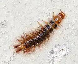 Die Larven haben einen langgestreckten, leicht abgeflachten und manchmal leicht C-förmig gekrümmten Körper. Bis auf das letzte Larvenstadium besitzen alle Larven eine auffällige Behaarung aus langen Setae, insbesondere am Rücken des Hinterleibs. Außerdem haben die Larven der Gattungen Malacogaster und Drilus stark sklerotisierte und pigmentierte Tergite und etwas weniger stark sklerotisierte Ventrite. Am Kopf sind die Mundwerkzeuge nach vorne gerichtet. Der Kopf ist sklerotisiert, kurz und teilweise in den Prothorax zurückgezogen. Auf beiden Seiten befindet sich je ein Punktauge (Ocellus). Ihr Labrum ist mit der Kopfkapsel verwachsen. Die Fühler sind dreigliedrig, wobei sich der Bereich mit den Sinnesrezeptoren am vorletzten Segment befindet, das kürzer ist als das letzte. Die Mandibeln sind schmal, sichelförmig und basal weit getrennt. Ihre Spitzen sind leicht nach oben gekrümmt und sie weisen Kanäle zum Saugen an der Beute auf. Die Maxillarpalpen sind viergliedrig, die Labialpalpen zweigliedrig. Die Larven besitzen einen dichten, haarigen präoralen Filter. Der Prothorax besitzt nahezu parallele Seitenränder, verbreitert sich nach hinten aber geringfügig. Er ist fast so lang wie Meso- und Metathorax zusammen. Die Beine sind fünfgliedrig, wobei die Prätarsen zwei spachtelförmige Setae tragen.[1]