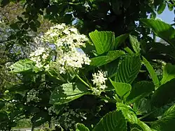 - Wolliger Schneeball (Viburnum lantana L.), eine sommergrüne Strauchart aus Europa und Westasien mit charakteristischen, stark behaarten Jungtrieben.