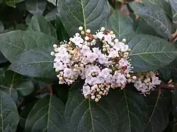 - Viburnum cinnamomifolium Rehder: Dieser große, immergrüne Strauch besitzt bis zu 15 Zentimeter breite Blütenstände. Die Heimat liegt in den südwestlichen chinesischen Provinzen Sichuan und Yunnan.[6]