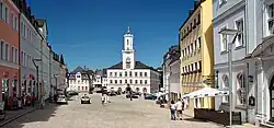 Ein großes Feuer zerstörte am 13. August 1719 fast die gesamte Stadt. Beim Wiederaufbau blieb der Stadtgrundriss der alten Bergstadt im Wesentlichen erhalten. Die Gebäude wurden im zeitgemäßen Barockstil neu errichtet, weshalb Schneeberg auch den Namen „Barockstadt des Erzgebirges“ trägt.[15] Zu den sehenswertesten Häusern dieser Zeit zählen das Schmeilhaus (1720/21), das Fürstenhaus (1721) und das Bortenreuther Haus (1724/25). Der Bereich der historischen Altstadt wird seit 1991/92 mit Fördermitteln des Städtebaulichen Denkmalschutzes saniert.