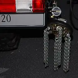 Schleuderketten (technische Bezeichnung: Rotationskette) sind Traktionshilfen für Fahrzeuge bei vereisten oder verschneiten Verkehrswegen. Sie bestehen aus mehreren Kettensträngen, die mit einer Seite an rotierenden Scheiben mit senkrecht angeordneter Drehachse befestigt sind („Kettenradsatz“).[4] Diese Kettenradsätze sind in der Nähe der Antriebsräder auf der Innenseite montiert. Bei schlechten Straßenverhältnissen werden sie in Drehbewegung versetzt, so dass durch die Drehung des Kettenrades die Kettenstücke durch die Fliehkraft auf eine Kreisbahn beschleunigt werden. Dadurch werden sie fortwährend von vorne zwischen Reifenlauffläche und Fahrbahn geschleudert. Rollt das Rad dann auf die Ketten, so ergibt sich wie bei Schneeketten eine höhere Reibung und Traktion. Die Rotorachse der Ketten ist um ca. 45° zur Vorderseite des Fahrzeuges hin gedreht. Die Drehrichtungen an linker und rechter Fahrzeugseite müssen entgegengesetzt sein. Bei Rückwärtsfahrt müssen die Drehrichtungen umgekehrt werden. Dies wird im Normalfall dadurch erreicht, dass die Kettenradsätze der Schleuderketten direkt in Form eines Reibradantriebes von den Reifenflanken der Fahrzeugräder angetrieben werden – im Prinzip wie bei einem Fahrrad-Seitenläuferdynamo.