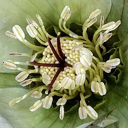 Die eigentlichen Kronblätter sind zu gelben bis gelbgrünen, tütenförmigen Nektarblättern umgebildet. Diese sondern reichlich Nektar ab und duften anders sowie intensiver als die Blütenhülle. Die zahlreichen, gelben Staubblätter sind an der verlängerten Blütenachse spiralig angeordnet.