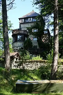 Sogenannte Schneiderburg: Malerische Gesamtanlage mit viergeschossigem Turmbau, Kalksteinbauweise mit Fachwerkaufbau, um 1923 Zeitgleiches zweigeschossiges Nebengebäude und Umfassungsmauer, Kalksteinmauerwerk