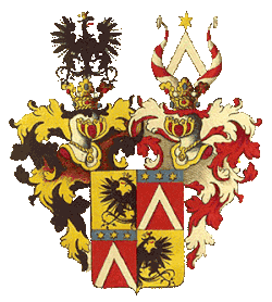 Geviertet. 1 und 4 in Gold ein goldgekrönter rotbezungter schwarzer Adler am Spalt. 2 und 3 in Rot ein silberner Sparren, am Schildeshaupt ein grau-blauer Balken mit drei sechszackigen goldenen Sternen. - Auf den zwei Helmen, rechts mit schwarz-goldenen Decken, ein goldgekrönter rotbezungter schwarzer Adler und links mit rot-silbernen Decken zwischen zwei von rot und silber eingebundenen Büffelhörnern, der Sparren auf dessen Spitze ein goldener sechszackiger Stern ruht.