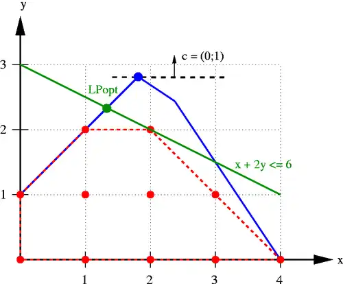 dargestellt. Die zulässigen ganzzahligen Punkte sind rot eingezeichnet, und die rot gestrichelten Linien kennzeichnen ihre konvexe Hülle, also das kleinste Polyeder, das alle diese Punkte enthält. Über diesem Polyeder soll eigentlich optimiert werden, aber es ist meist nicht genau bekannt. Die blauen Linien zusammen mit den Koordinatenachsen begrenzen das Polyeder der LP-Relaxierung, das durch das Ungleichungssystem ohne Ganzzahligkeitsbedingungen gegeben ist. Ziel der Optimierung ist es, die schwarz gestrichelte Linie so weit parallel nach oben (in Richtung des Vektors ) zu verschieben, dass sie das jeweilige Polyeder gerade noch berührt. Die Optimallösungen des ganzzahligen Problems sind also die Punkte und mit dem Zielfunktionswert . Die – in diesem Fall eindeutige – optimale Lösung der LP-Relaxierung mit dem Zielfunktionswert 2,8 ist der blau markierte Punkt , der nicht ganzzahlig und damit auch nicht zulässig für das IP ist.