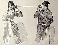 Es besteht aus zwei einseitig geöffneten, leeren Konservendosen oder Papp- oder Kunststoffbechern, die mit einer mehrere Meter langen, frei gespannten Schnur oder einem Draht rein mechanisch verbunden sind. Die beiden Schnurenden werden jeweils durch ein zentrisches Loch im Boden der Dose geführt und mittels eines Knotens daran gehindert, wieder hinauszurutschen. Bei Benutzung muss die Schnur stramm gespannt sein, so dass eine gewisse Stabilität des Dosenbodens notwendig ist, außerdem darf sie nirgendwo anstoßen, also nicht z. B. um eine Ecke gelegt oder in einer Tür eingeklemmt werden.