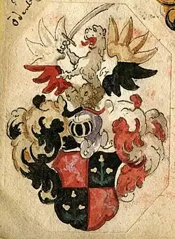 Blasonierung des Wappens von 1622: Quadriert. Felder 1 und 4 in Rot ein rechts gekehrter silberner Löwe; Felder 2 und 3 in Schwarz ein goldener zu Pfahl gestellter Zweig mit drei goldenen Eicheln. Auf dem gekrönten Helm mit rechts schwarz-goldenen und links rot-silbernen Decken ein offener, rechts von Silber über Rot, links von Gold über Schwarz geteilter Flug, dazwischen ein silberner, säbelschwingender Löwe wachsend.[2]