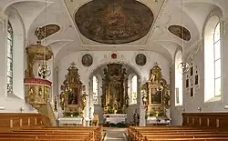 - Um 1500 stand hier eine Kapelle. 1610 und 1682 erfolgten Neubauten und die heutige Kirche mit Turm wurde 1710 erbaut. 1796 erfolgte eine Neugestaltung durch Josef Anton Natter und Josef Simon Moosbrugger. 1956/1957 wurde die Kirche nochmals vergrößert und es wurde eine Orgelempore nach Plänen von Kaspar Albrecht eingebaut. Es finden sich Stuckdekor von Franz Michael Felder (1796) und Figuren von Christian Moosbrugger (1928). An der Südwand des Chores befindet sich ein Denkmal mit Profilportrait des Dichters Franz Michael Felder (1839–1869)